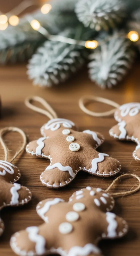 Felt gingerbread ornaments bring that bakery-window charm to your tree. Cut simple gingerbread shapes from brown felt, stitch edges by hand, and add white thread to mimic icing. You can glue tiny beads as buttons or embroider little smiles for character. These ornaments work well if you’re decorating with soft neutrals or playful candy-house themes. Keep scraps and let kids help cut simple shapes like stars or mittens. If you don’t sew, hot glue works fine. For fragrance, tuck a bit of cinnamon inside. Make a batch to hang on the tree or tie to gifts. They look beautiful against twinkling lights and bring a sweet, nostalgic feeling. Store extras in a small tin for gifting.