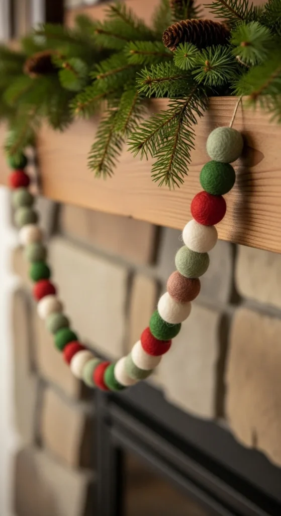 A felt ball garland brings gentle texture. Thread wool balls onto twine with a needle and space them evenly. Choose traditional colors or keep to simple neutrals for a Scandinavian mood. Hang across windows, shelves, or stair rails. Kids enjoy helping pick colors and sliding balls along twine. If you can’t find premade felt balls, roll your own with wool roving and warm soapy water. Make it long enough to drape generously. Store in a small cloth bag to avoid tangles.