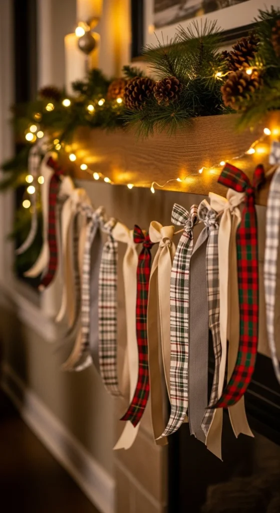 Cut ribbon into equal pieces and knot along twine to form a tassel-style garland. Mix textures like velvet, gingham, linen, and lace. This adds cozy softness that works well on mantels or stair rails. Choose muted tones if you enjoy calm decor or bold red for classic style. Kids enjoy tying ribbons. Start at the center and work outward for even spacing. Keep leftover ribbon for gift wrapping.