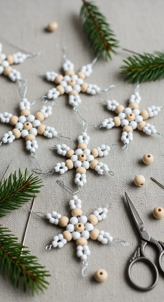 Beaded snowflakes feel clean and delicate. String wooden or pearl-style beads onto thin wire and twist into snowflake shapes. Add a loop to hang. They look pretty against twinkle lights and pair nicely with neutral ornaments. Mix bead sizes for dimension. This works well for craft nights because pieces come together quickly. Store in small envelopes so wires don’t bend.