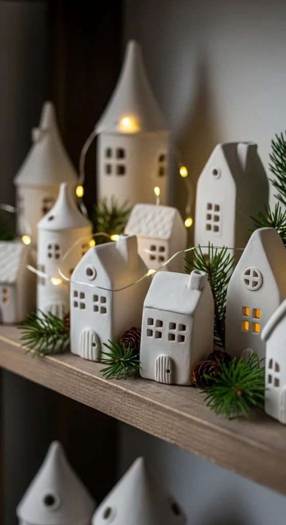 Hand-molded clay houses create a dreamy winter village. Shape simple houses from air-dry clay and let them dry fully. Paint soft white if desired. Arrange on a mantle with lights behind to mimic glowing windows. These pieces feel peaceful and can stay out all winter. Kids enjoy shaping roofs and chimneys. Keep designs simple for charm. Store wrapped in tissue after the season.