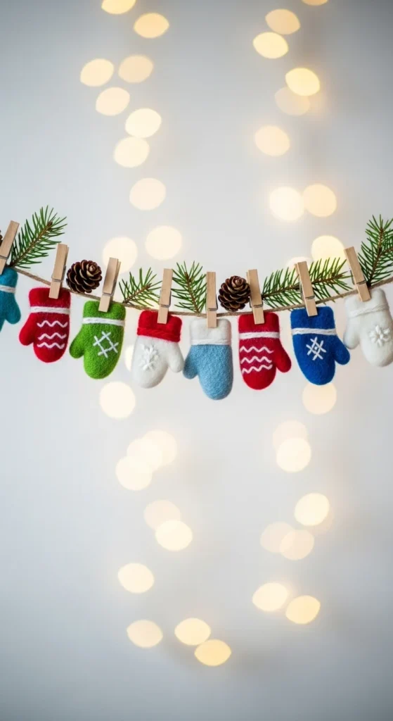 Cut small mitten shapes from old sweaters or felt. Sew edges or glue if preferred. Clip onto twine with tiny clothespins and add little sprigs of pine. Hang above windows or in kids’ rooms. Mix patterns and colors for cozy fun. Use sweater scraps to stay budget-friendly. This garland pairs nicely with chunky knit pieces and warm lighting.