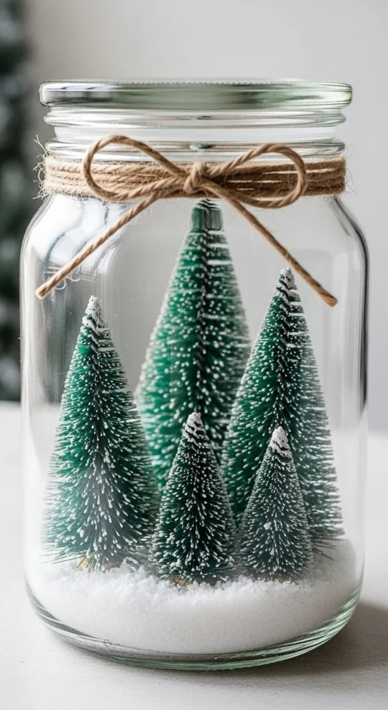 Create a mini winter scene inside jars. Add faux snow, tiny trees, and wood slices. Tie ribbon or twine at the top. Display on shelves or centerpieces. These match cottage and vintage decor styles. Try mixing jar sizes and adding little deer figures for charm. Kids enjoy placing tiny pieces. Shake lightly for falling-snow effect.
