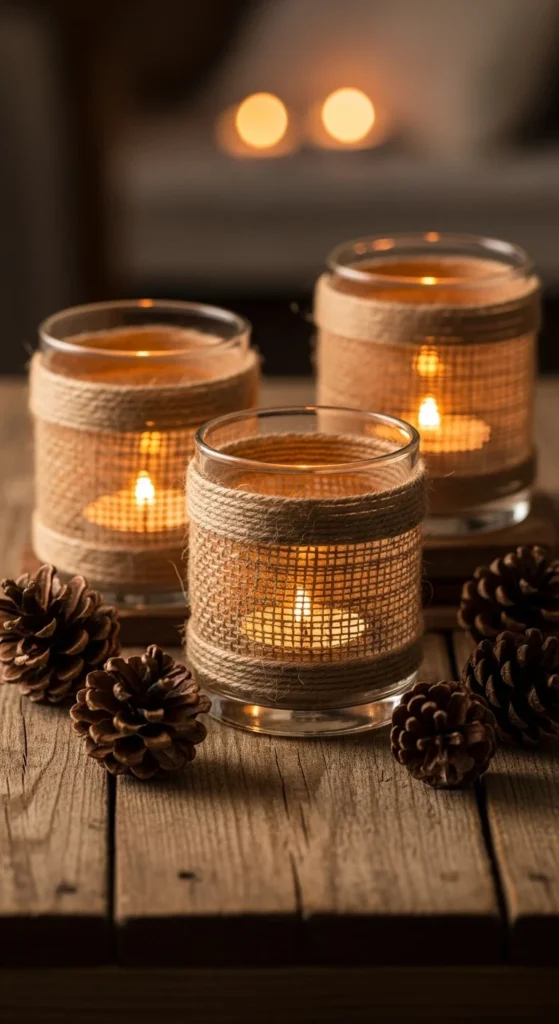 Wrap glass jars or votives with jute twine and secure with glue. Add tiny charms like bells or wood beads. These candle holders feel natural and earthy. Place along dining tables or shelves. Use battery tea lights if around kids. Balance texture by pairing with smooth ceramics or greenery.