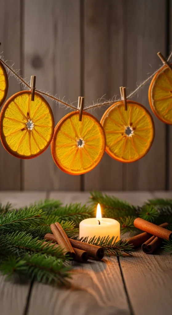 Dried orange garlands add natural glow and a farmhouse touch. Slice oranges thin, pat dry, and bake low and slow until crisp. Once cool, thread them on twine and alternate with cinnamon sticks or star anise. The gentle citrus scent fills your home with holiday warmth. Hang along a mantel, across windows, or weave into garlands. Kids enjoy placing slices in patterns, and you only need basic kitchen supplies. If you love Scandinavian or rustic decor, this fits beautifully. For extra charm, mix in bay leaves or fresh greenery. Store finished pieces flat so they keep their shape through the season. These garlands catch sunlight during the day and look magical by candlelight at night.