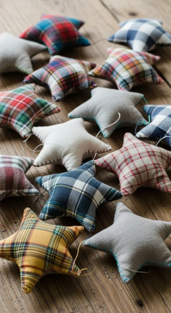 Turn leftover fabric into stuffed stars. Cut two star shapes, sew edges, stuff lightly, and stitch closed. Add tiny buttons or twine loops. Hang from branches or pile in a bowl for decor. Choose plaids, muslin, or flannel for cozy texture. This is a great scrap-busting craft and easy to personalize.