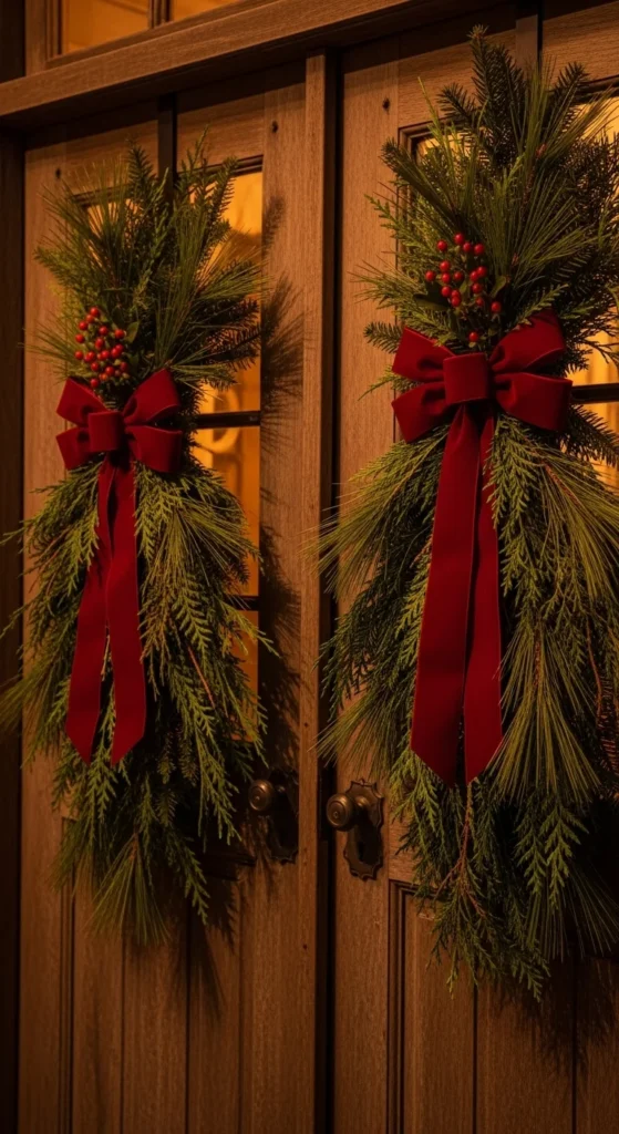 Gather pine branches, tie stems with twine, and finish with ribbon. Hang on doors, mirrors, or windows. Add berries or bells if you like. These feel simple and natural, fitting minimal holiday styles. Make several small swags instead of one large arrangement. Mist occasionally to keep fresh.