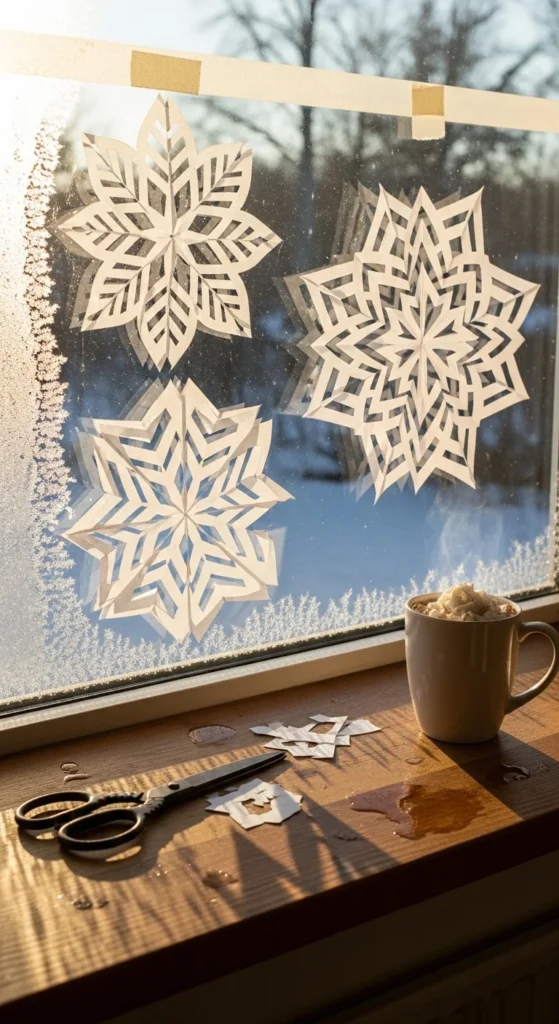 Paper snowflakes are classic because they feel playful and wintry. Fold simple sheets, snip, and open to reveal delicate patterns. Stick them to windows using tiny dots of tape or clear adhesive stickers. The charm comes from variety—large, small, round, and star-shaped. Kids love unfolding their own creations. Use white, soft gold, or even pale pastel paper for a dreamy effect. If you want extra sparkle, dust edges with a bit of glitter glue. Hang strands vertically for a curtain-style snowfall look. Keep a folder to store patterns and reuse them next year. You don’t need fancy paper to make something beautiful—printer sheets work perfectly.