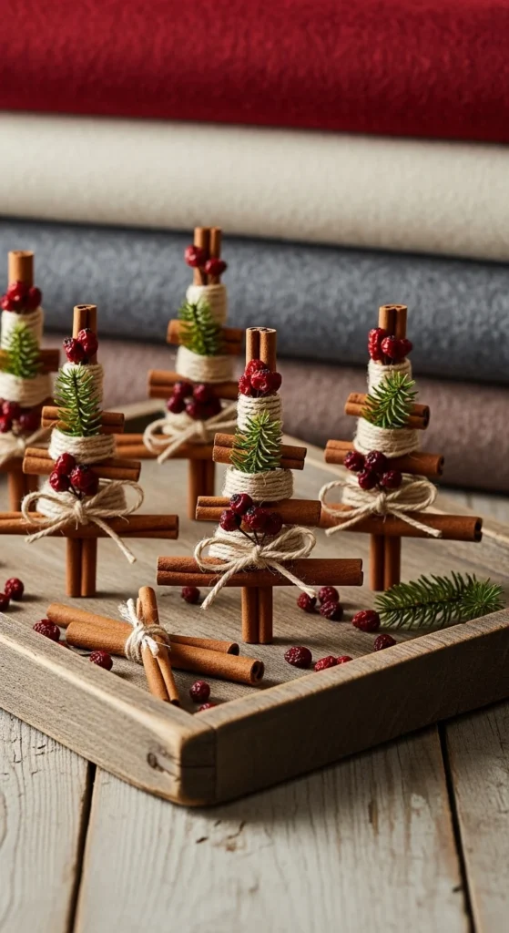 Mini cinnamon-stick trees bring warmth and fragrance. Glue sticks together like a triangle frame, add small branches of evergreen, and layer dried berries or cloves. Tie a jute bow on top. These tiny trees sit nicely on shelves, coffee tables, or window ledges. They double as charming gift toppers. Kids can help place berries or cut greenery. Choose real or faux pine depending on what you have. Make a group of three different heights for balance. If you enjoy earthy colors and rustic textures, this project fits perfectly. Keep leftover sticks for simmer pots later.