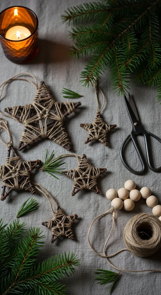 Twig stars add a woodland mood to your home. Gather thin twigs and cut them to equal lengths. Arrange into star shapes, tie with twine, and hang on the tree or walls. Add wood beads or dried leaves for small accents. This craft encourages outdoor time—collect twigs during a crisp winter walk. Use neutral string for calm decor or red thread for a traditional feel. These stars look stylish with cozy cabin themes. Cluster several above a mantel for wall art. Keep leftovers to craft matching hearts or triangles for a nature-themed garland.