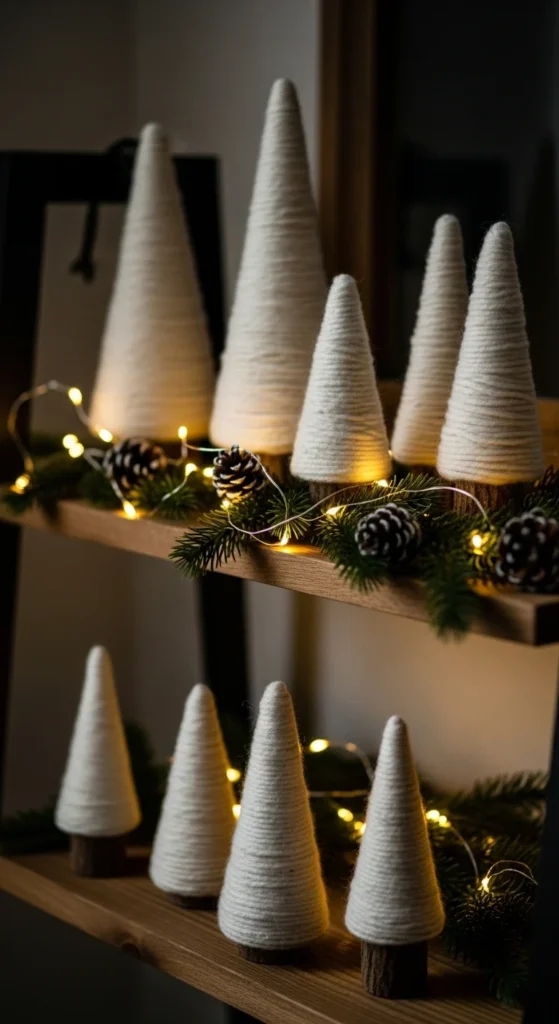 Yarn-wrapped trees give that soft winter cottage look. Wrap foam cones tightly with chunky yarn, secure ends with glue, and add tiny wood beads or pearl accents. Mix textures like boucle, wool, and cotton. Place them in groups on tabletops or mantels. This craft works well for people who love neutral holiday palettes. If cones are expensive, make cones out of cardstock. Kids enjoy gluing tiny stars or bells on top. Pair with candles and greenery for a calm, snowy vignette. Store in a box to reuse every year.