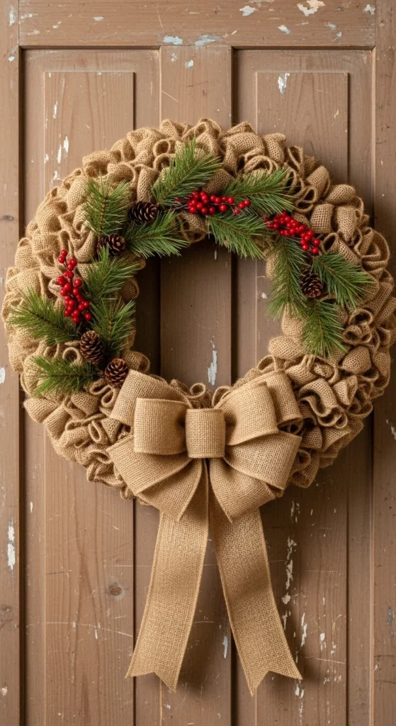 A burlap wreath brings farmhouse style without much effort. Loop burlap ribbon through a wire frame and fluff sections as you go. Add pine sprigs, simple berries, or a bow. Stick with warm neutrals or choose deep red ribbon for a holiday hint. Hang on front doors, mirrors, or walls. This craft lasts year after year and costs less than store-bought wreaths. Work slowly and adjust folds until the shape feels full. Swap greenery each season for a fresh look.