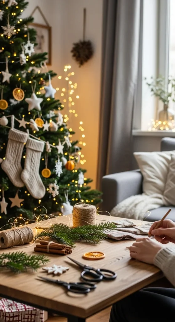 This craft also fills your home with cozy fragrance. Dry orange slices, gather pine sprigs, and bundle cloves and cinnamon sticks in small muslin bags tied with ribbon. These make charming gifts or display pieces. When ready, simmer in water for a festive scent. Create a basket full and let guests take one when visiting. Add a handwritten note with directions. This project suits cottage-style holiday homes and makes hosting feel extra thoughtful.