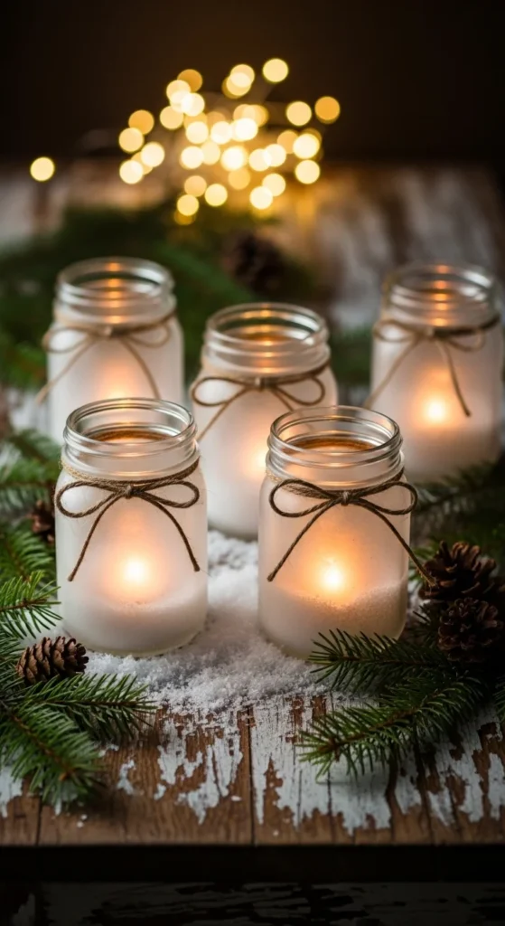 Mason jar snow lanterns bring soft winter glow to any room. Brush jars with diluted white paint or use spray frost for a hazy look. Add faux snow or table salt at the bottom, place tealights inside, and tie twine around the rim. This works on mantels, window ledges, and dining tables. Use jars you already have so the project stays low-cost. Add a tiny pine cone or bell for charm. Try three jars of different heights grouped together for more impact. These lanterns look lovely with both candlelight and battery lights. Store neatly so they last year after year.