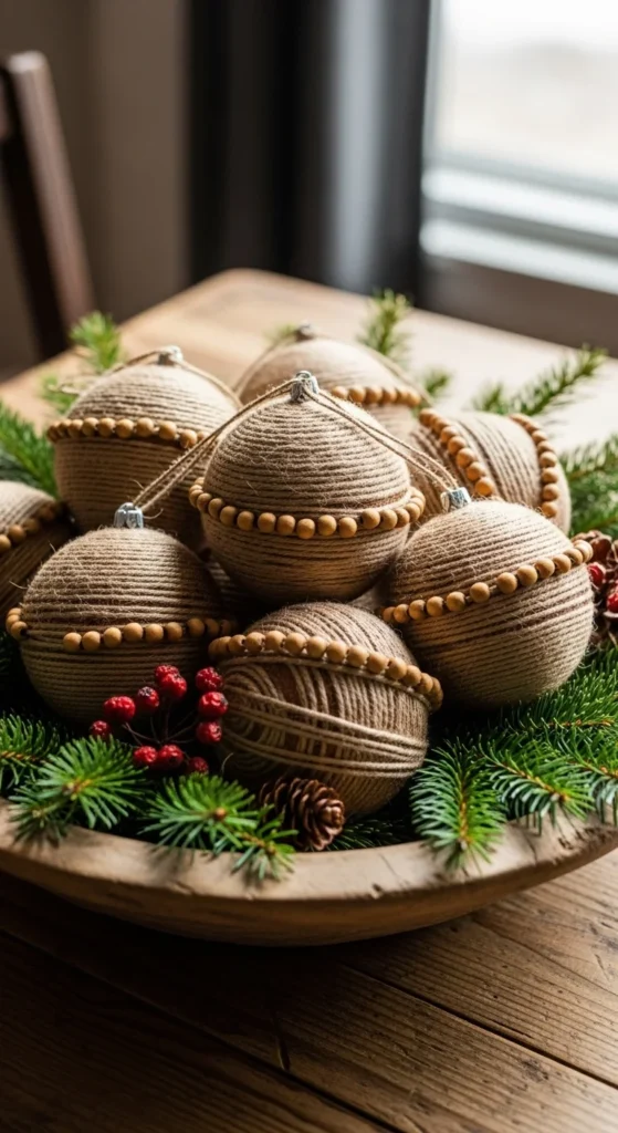 Wrap plain ornaments in twine and secure ends with glue. Add beads or bows. These fit rustic and farmhouse styles. Use plastic ornaments to keep it safe if crafting with kids. Hang on trees or place in bowls. This is great for leftover twine scraps.