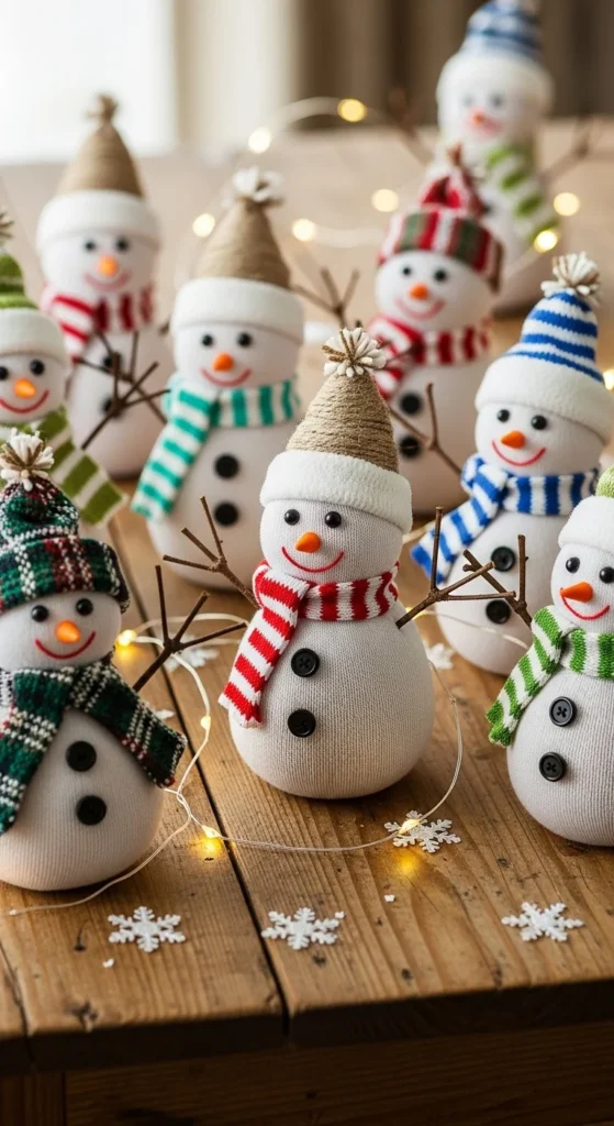 Fill white socks with rice, tie to form body and head, add buttons and a small scarf. These soft snowmen are adorable for shelves or kids’ rooms. Use old socks and scrap fabric. Draw faces with marker or glue tiny beads. Secure well so rice stays inside.