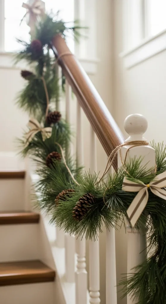 Tie pine branches along handrails with twine. Add bows or oranges for detail. This feels natural and classic. Use faux branches if you want to keep it simple. Let pieces drape slightly for a soft look. Sweep needles regularly if using real pine.