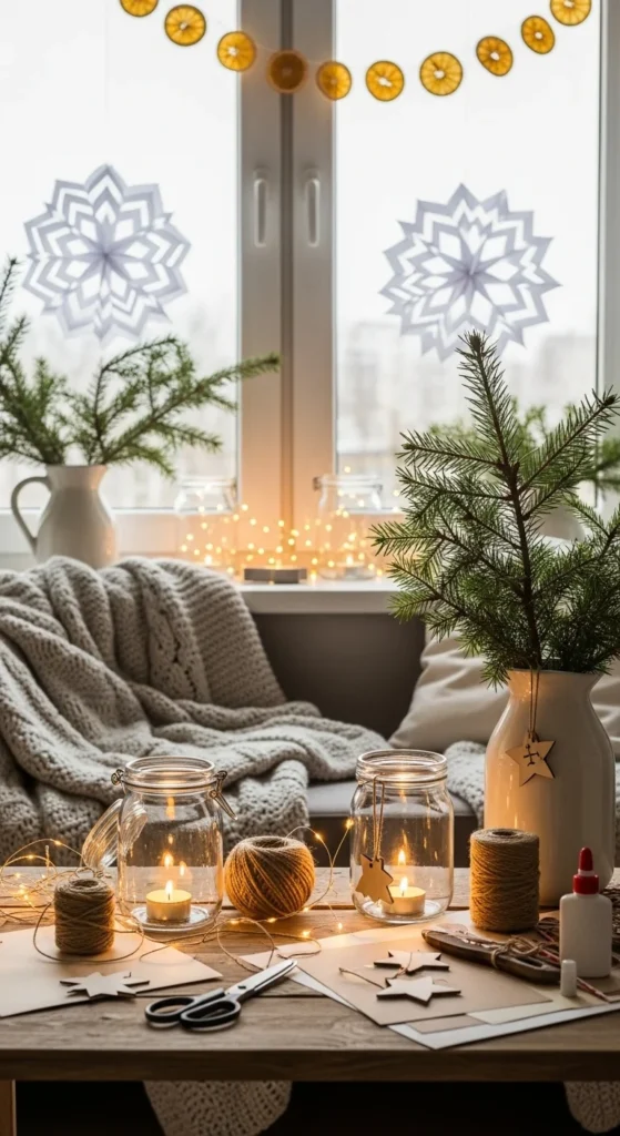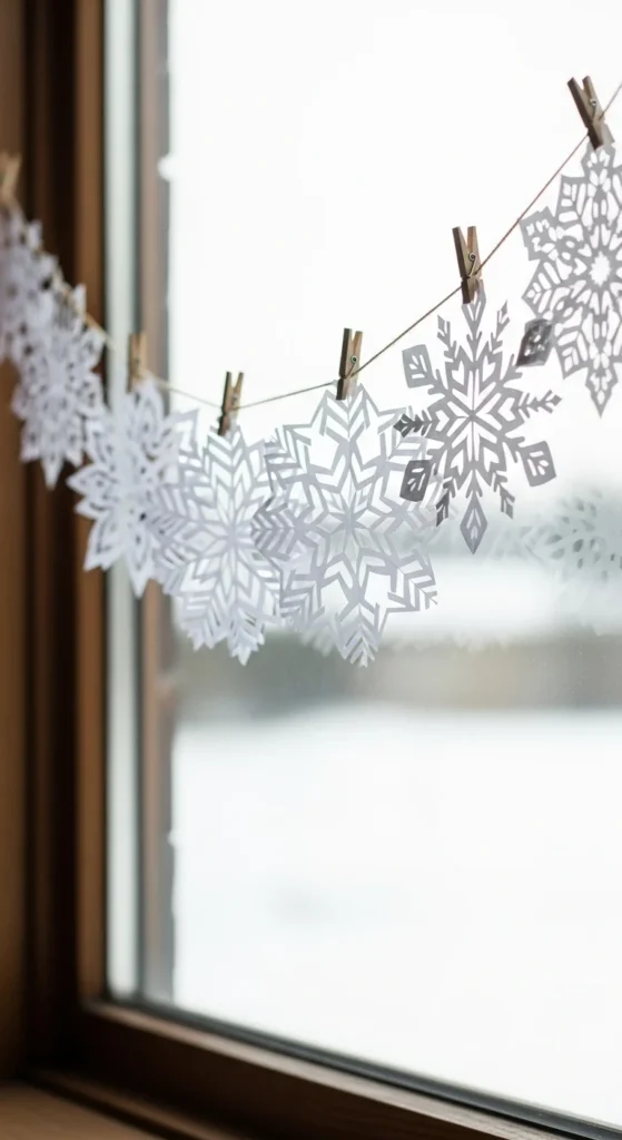 Cut snowflakes and clip them along twine with mini clothespins. Hang across windows or mantels. Kids love cutting shapes. Use printer paper or tissue sheets for variety. This is light, airy, and sweet for small spaces.