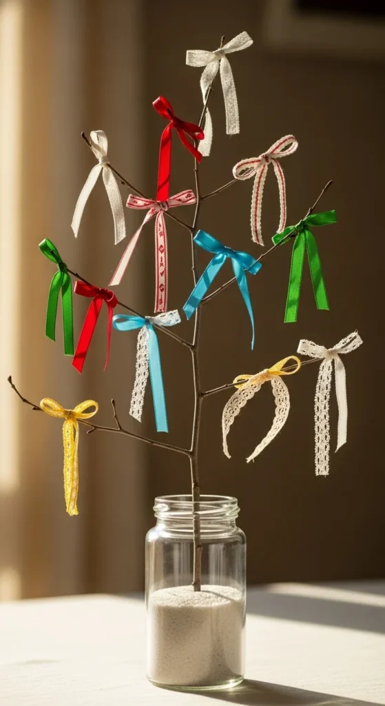Stick a branch into a jar of rice or pebbles. Tie ribbons along branches to look like a festive tree. This craft uses leftover materials and adds whimsy to desks or shelves. Keep colors simple for calm style or mix bright ribbons for fun.