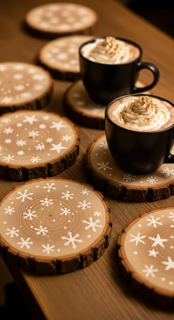Use wood slices as coasters and paint tiny stars or snowflakes. Seal with clear coat. These sit well on tables for holiday gatherings. Stack a few and tie with twine for gifts. Keep designs minimal for charm.