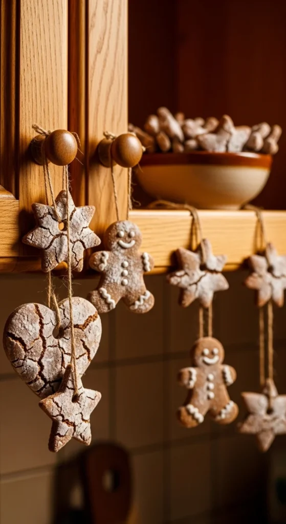 Bake gingerbread and punch holes before baking so you can hang them. Tie twine and display on cabinets or shelves. This brings cozy bakery charm. Replace cookies gradually as you eat them. Store extras in tins.