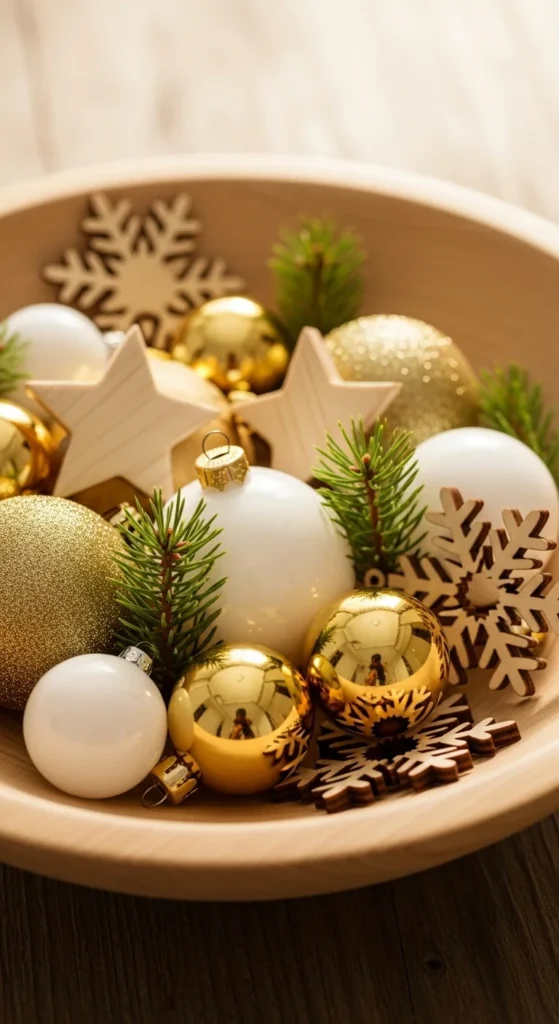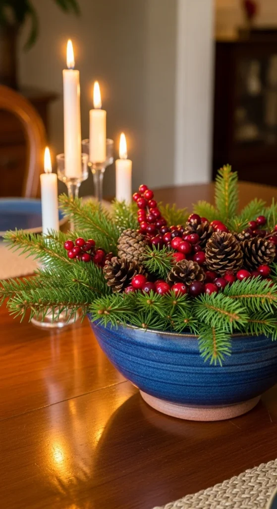 Fill a bowl with pine branches, cranberries, and pinecones. Fast, natural, and low-cost. Add a ribbon for color. Great for centerpieces or bathroom counters. Refresh greenery as needed.