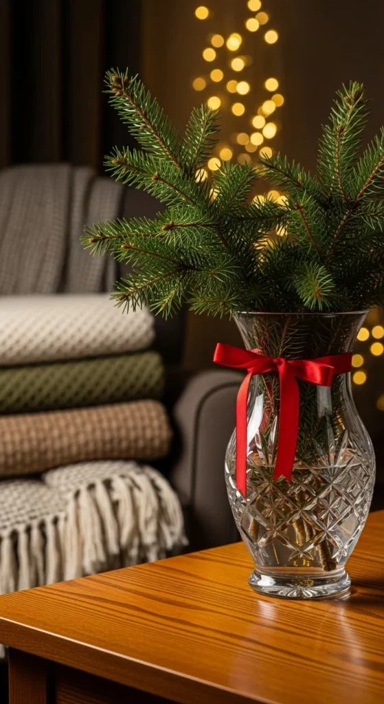 Gather pine branches from your yard or a local market. Trim stems and place in a clear vase with water. Add cranberries or a ribbon around the vase for a festive look. This brings natural scent and color into the space without clutter. Change the water every few days to keep branches healthy. If you want long-lasting decor, use faux branches instead. Pair the vase with candles and simple ornaments nearby. This works nicely in entryways, coffee tables, and nightstands. It’s fast, easy, and always charming.