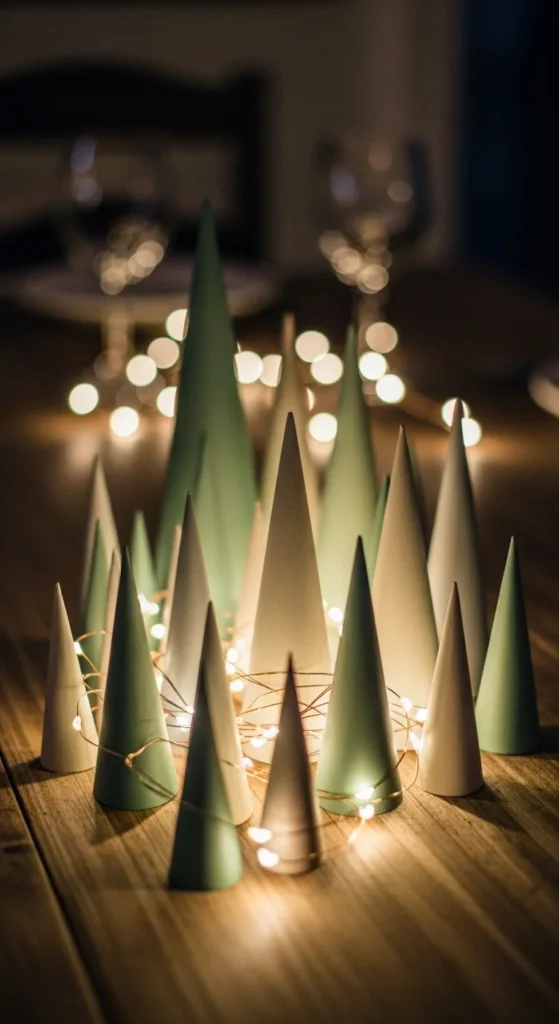 Roll cardstock into cone shapes and secure. Paint or wrap with paper. Arrange multiple sizes for a tiny forest scene. This suits minimal decor styles. Add glitter edges if desired. Display on coffee tables or shelves.