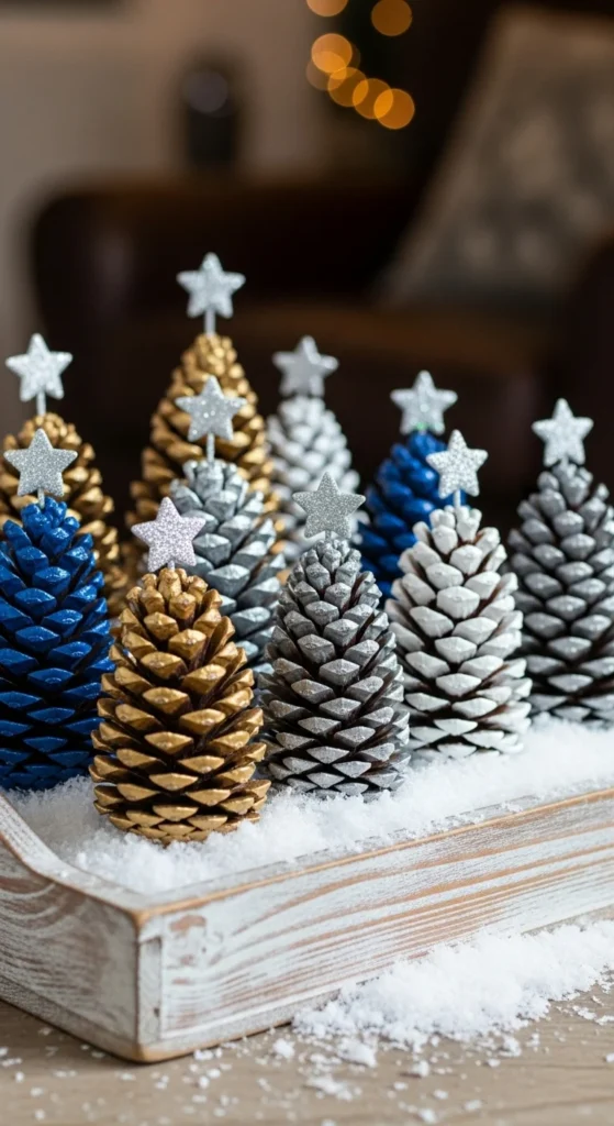 Stand pinecones upright and paint lightly with green or white. Add tiny stars or beads as toppers. Arrange on trays or shelves. Kids enjoy decorating each one. Keep a group together for a cute forest display.
