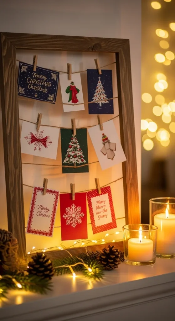 Hang twine inside a frame and clip Christmas cards to it. This keeps counters tidy and makes cards part of decor. Use mini clothespins for charm. Add a bow at the top. Reuse frame year after year.
