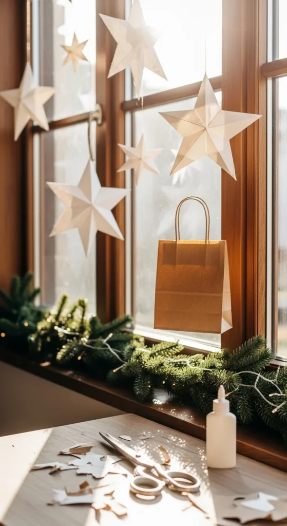 Paper bag stars add big impact with little cost. Glue lunch bags into stacks, cut shapes, and unfold into large star decorations. Hang them near windows or from ceilings using twine. Use kraft for a rustic feel or white for a snowy look. Kids enjoy cutting shapes, so this project works well as a family craft night idea. Add a bit of glitter along edges if you like subtle sparkle. These fold flat for easy storage.