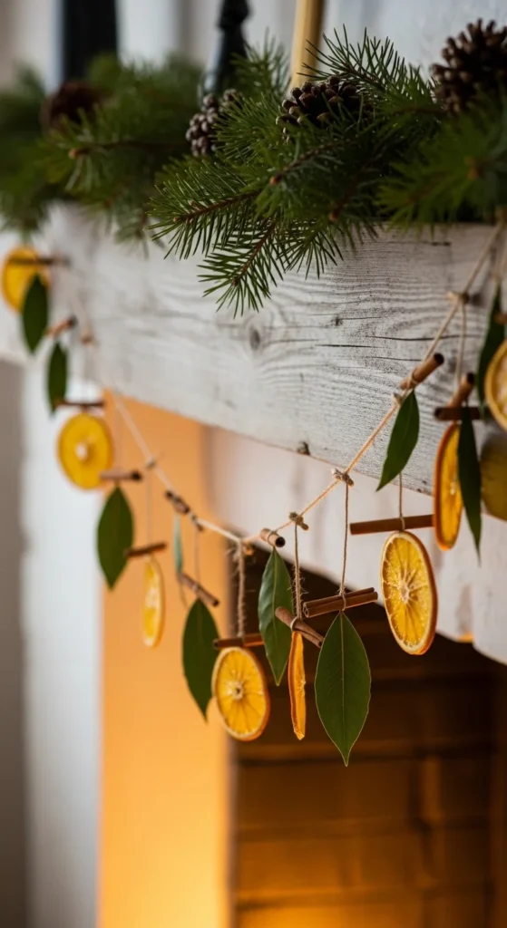 Slice oranges thinly, dry them in the oven on low heat, and string on twine. Alternate with cinnamon sticks or bay leaves. This brings warm color and natural fragrance. Hang across windows, doors, or along mantels. Use kitchen twine if you don’t have craft string. For variety, mix in dried grapefruit slices too. Store flat once season ends.