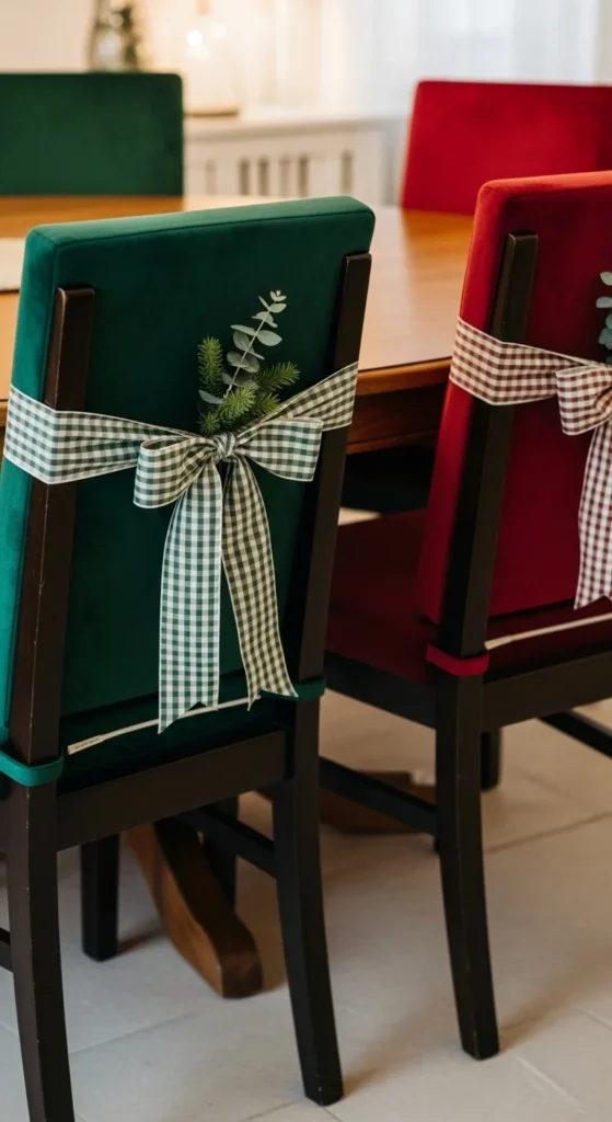 Add holiday charm to your dining space by tying ribbon bows on chair backs. Use scraps of fabric, velvet ribbon, or burlap. Tuck in a pine sprig or a small ornament for extra detail. This takes just minutes but brings seasonal warmth to meals. Choose colors that match your theme. Save ribbons for next year.