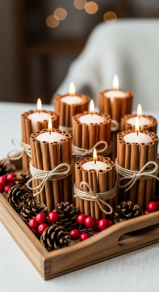 Wrap cinnamon sticks around pillar candles and secure with twine. These add cozy scent and texture. Use battery candles if worried about heat. Arrange on trays or shelves. Mix heights and add pine sprigs nearby. These make sweet hostess gifts too.