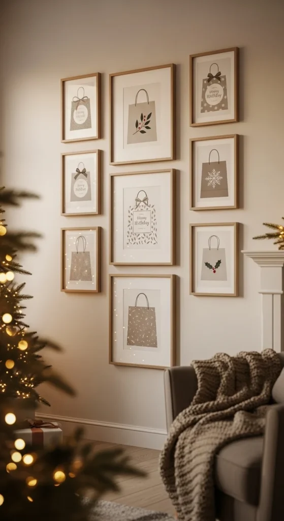Cut pretty patterns from holiday gift bags and frame them. Hang in a grid for simple wall decor. This is budget-friendly and looks stylish. Choose designs that feel calm and seasonal. Use frames from thrift stores or ones you already have. Swap out prints each year.
