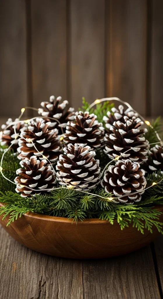 Collect pinecones and brush white paint along edges for a snowy look. Place in bowls, trays, or use as filler in vases. Make a cluster for centerpieces. Kids enjoy painting cones. Add a little glitter if you love sparkle. Display near candles or string lights for glow.