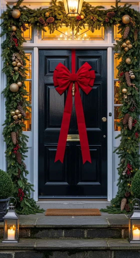 A giant red bow always feels joyful. Start with a sturdy velvet ribbon and attach it to the top center of the door. Wrap matching ribbon around a thick evergreen garland and drape it around the frame. Add gold bells or berry picks for a festive touch. This look suits traditional homes and feels timeless. If your door is a bold color, let the bow shine as the main feature. For renters, use removable hooks and lightweight faux garland. Pair with lanterns holding battery candles to welcome guests with soft glow. Keep extra ribbon handy to tie small bows on porch railings or planters for cohesion.