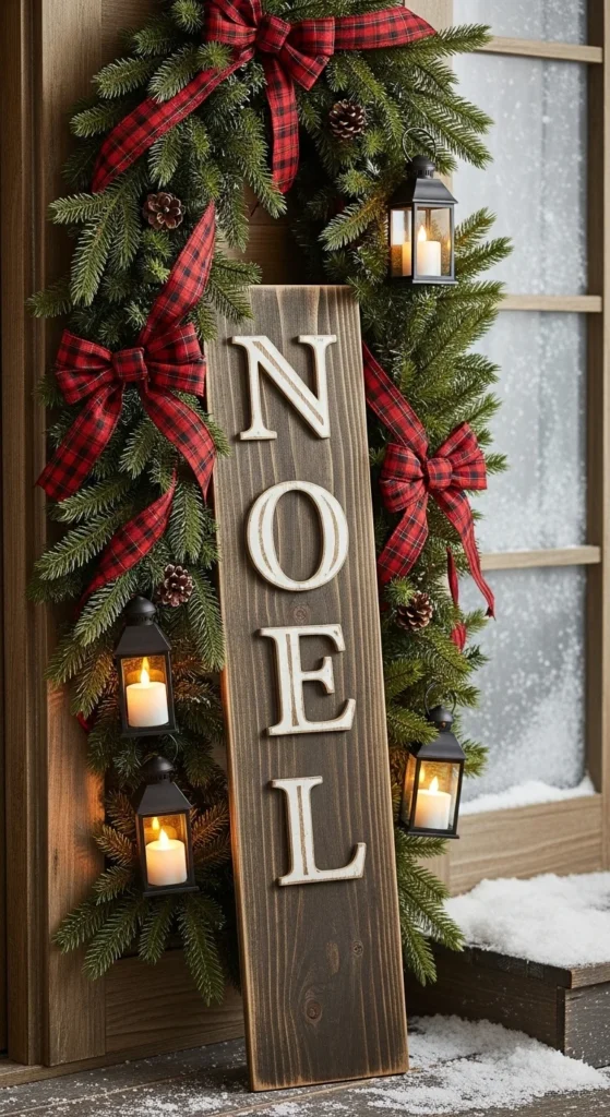 Lean a tall handmade wooden sign next to the door for a warm handmade touch. Add mixed greenery garland with plaid ribbon and tiny wood ornaments. Use lanterns with battery candles for finishing touch. This porch idea suits farmhouse settings and cozy entry steps. Paint your sign in neutral tones with gentle lettering. Seal wood so it lasts in weather.