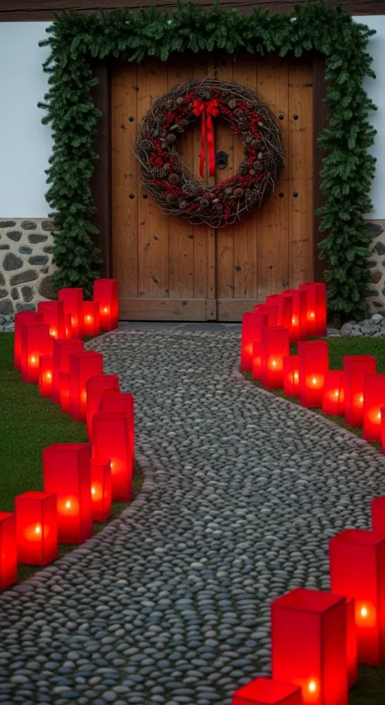 Line walkway or steps with red lanterns and battery candles. Decorate door with garland and a large wreath to coordinate. Add pine branches in planters on each side. This creates a welcoming path for guests at night. If using real candles, keep them protected from wind. Add jute bows to lantern handles for rustic touch.