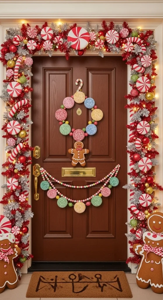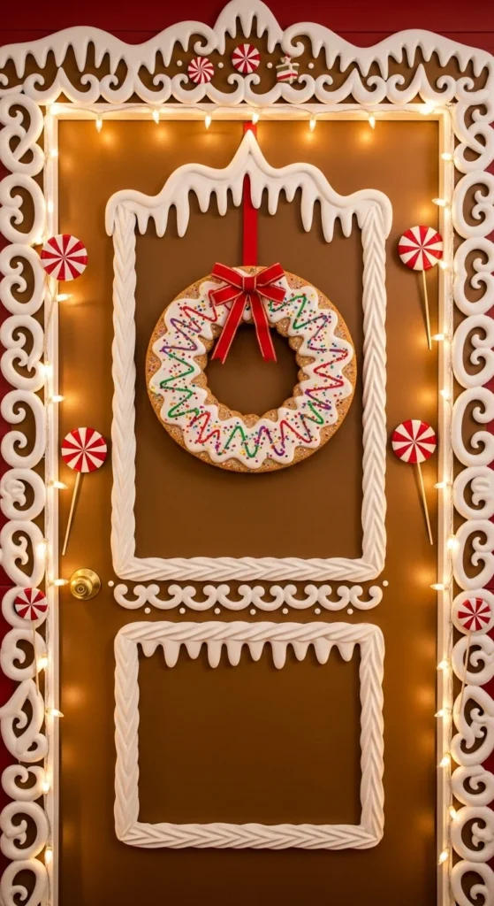 Apply removable scalloped molding or white paint accents around door trim to mimic icing. Add candy canes, peppermint swirls, and gingerbread figures. This cottage-cute look suits small porches or entryways. Add tiny fairy lights tucked into garland. Kids love helping hang candy ornaments. Keep tones warm to stay cozy rather than too bright.