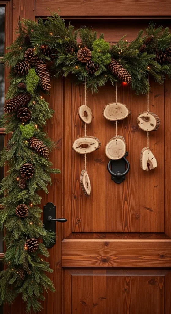 Create a woodland scene using pine, cedar, and eucalyptus mixed greens. Add pinecones, dried oranges, and wood slice ornaments. Use amber lights to warm the tone. Place wood crates with birch logs and moss bundles beside the door. Works beautifully for cabins or rustic homes. Keep textures natural and skip bold colors.