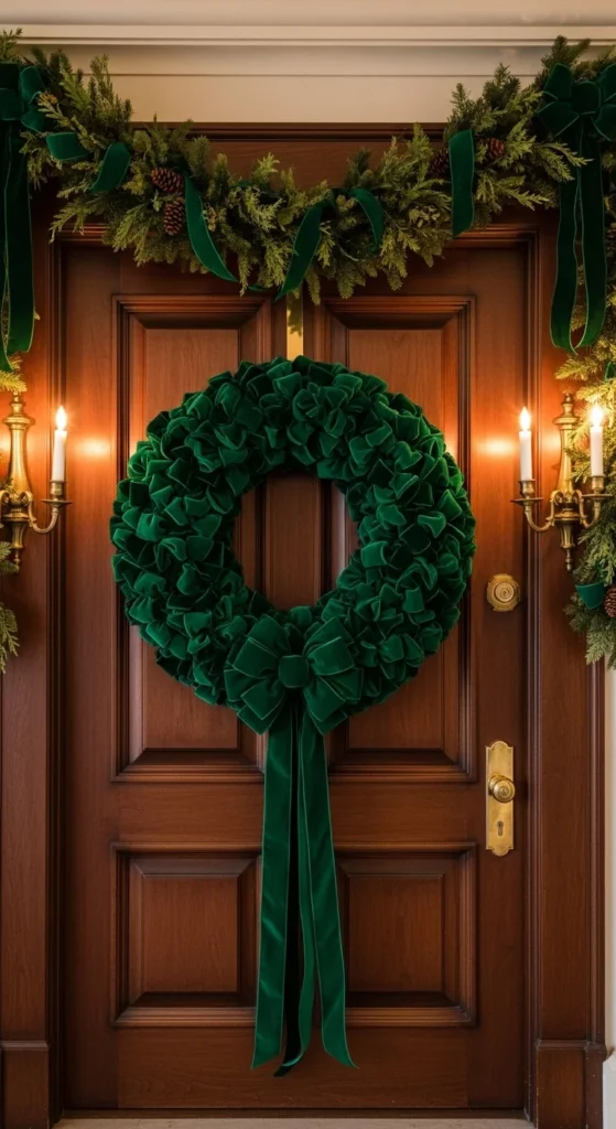 Tie thick velvet ribbon on wreath and drape matching strand across door frame. Add battery candle sconces to each side. This luxurious style fits bold doors and elegant porches. Choose deep tones like emerald or burgundy. Keep greenery lush and simple. Avoid too many ornaments to let ribbon shine.