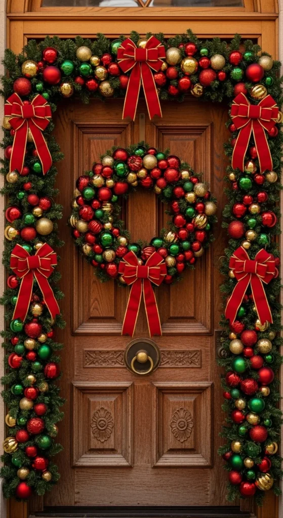 Attach ornaments of different sizes to garland and wrap around doorway. Use a matching wreath to unify look. Place one oversized ornament in planters for balance. Stick to three main colors for clean effect. Add matte and glossy finishes for depth. Works well when you want a festive, lively entry.