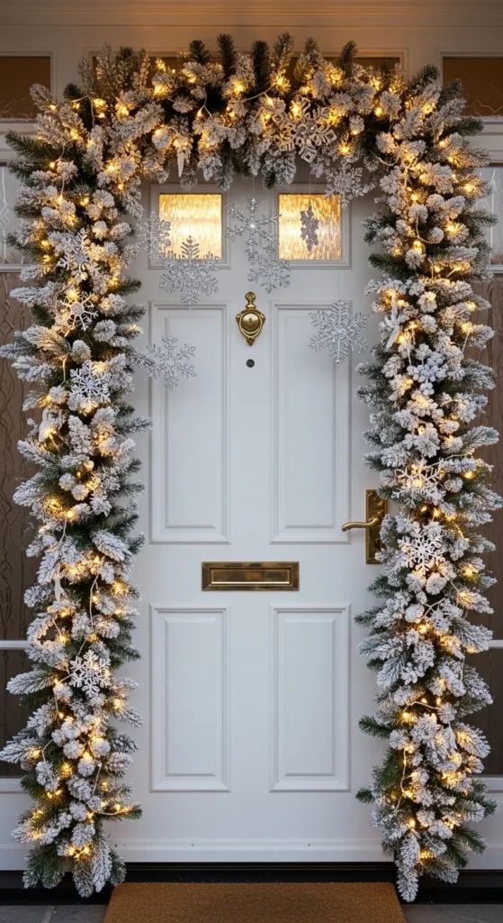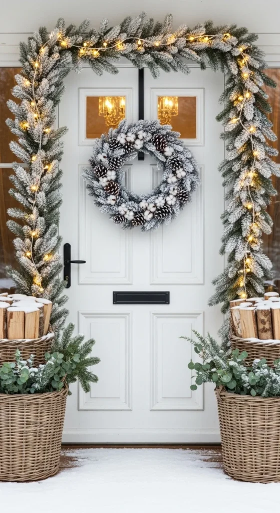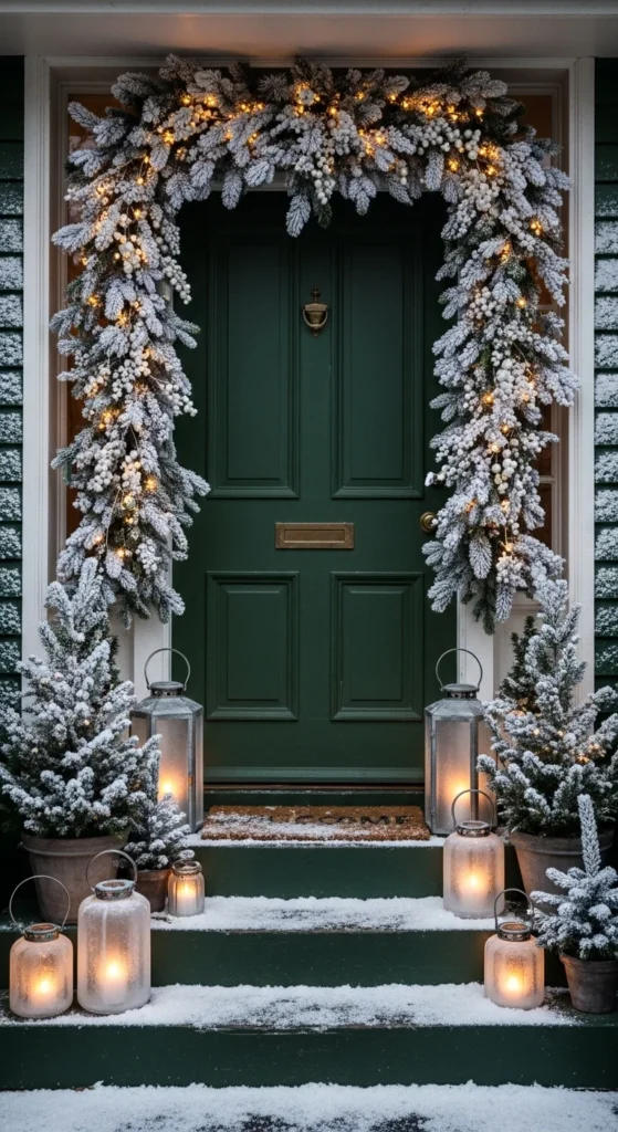 Layer snow-flocked garland around your door and tuck in white berries and silver ornaments. Choose a flocked wreath to match. Place small potted mini trees on each side and dust with faux snow spray. Add soft twinkle lights for sparkle. This look feels magical, like stepping into a winter wonderland. Keep accents mostly white and silver to maintain calm tone. A small wood sign like “home for the holidays” adds warmth by the steps. If your climate is warm, use faux snow spray lightly for effect without overdoing it.