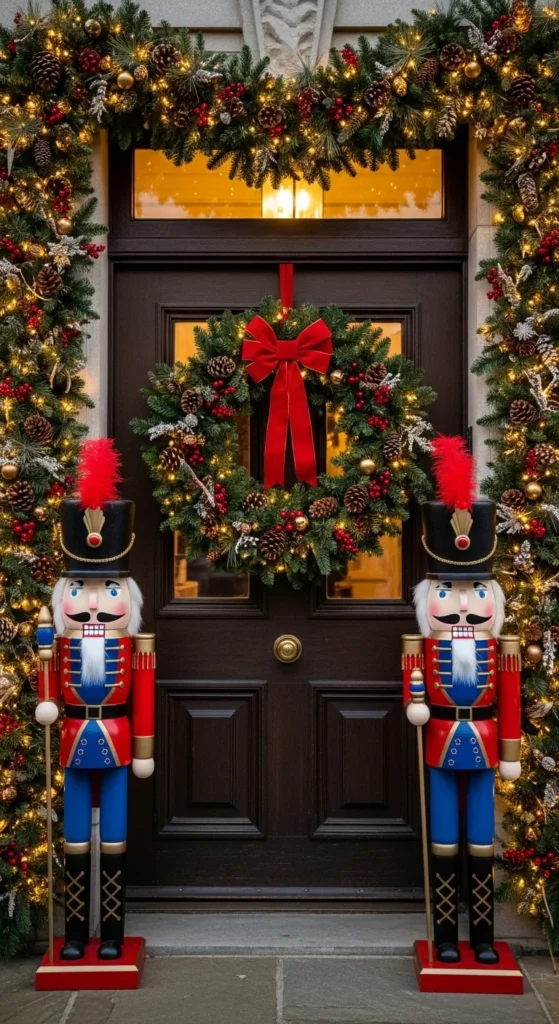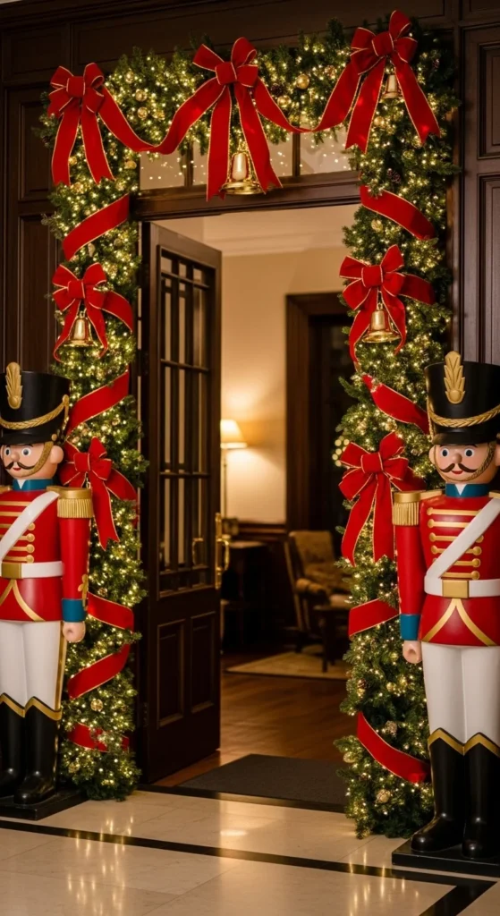 Place two nutcracker figures at each side of your doorway to create a grand greeting. Add classic garland overhead and hang a wreath with bright ribbon. This theme works beautifully with red and gold accents. Use symmetrical decor pieces to frame the doorway. If nutcrackers are expensive, choose inflatable versions or DIY sturdy cardboard ones for kids to help paint. Keep rest of decor structured and tidy to fit the traditional theme.