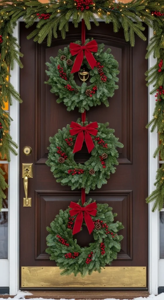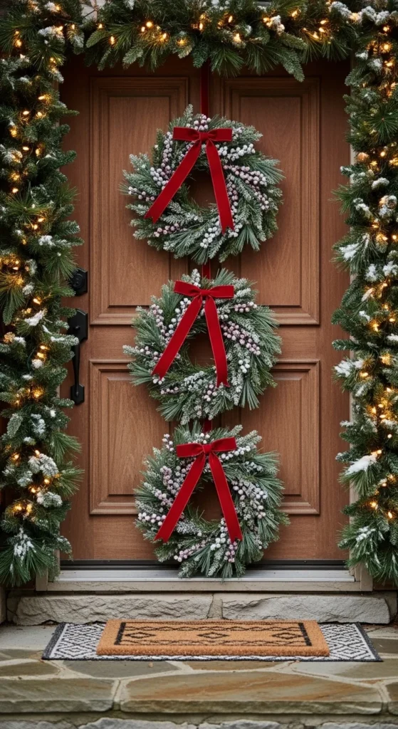Hang three smaller wreaths instead of one large one. Tie each with thick velvet ribbon in a single vertical line. Frame door with simple garland and warm lights. This look feels graceful and clean. Works especially well on tall doors. Use simple evergreen wreaths for timeless charm.