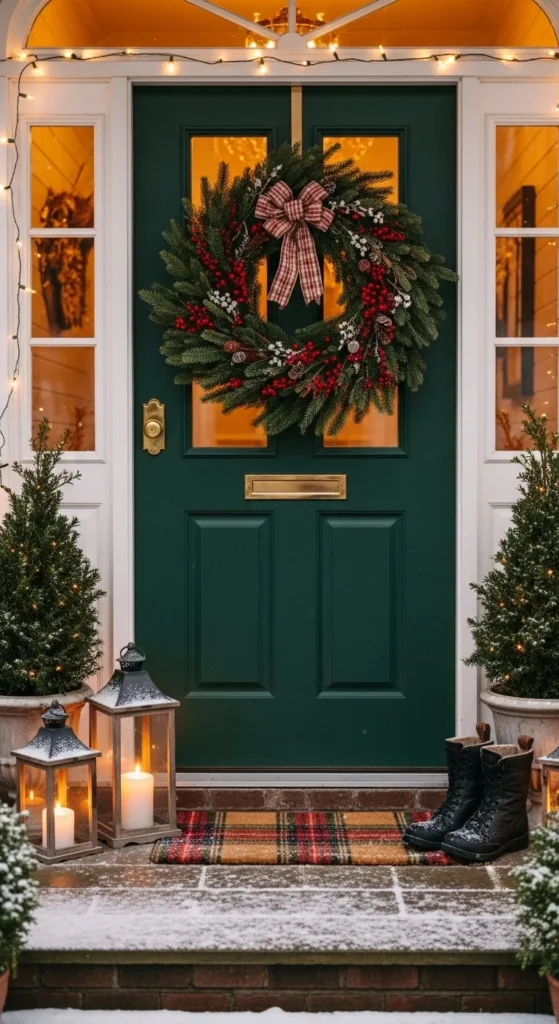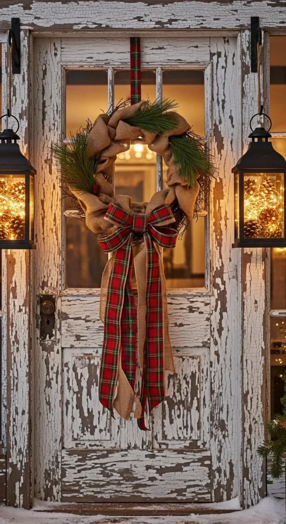 Plaid brings classic holiday charm. Wrap plaid ribbon around a wreath and hang with a thick bow. Tie smaller plaid bows to planters, lanterns, and door handles. Mix in burlap and twine for rustic texture. Add pine picks or tiny bells to corners of the doorway. If space allows, place two galvanized buckets with cedar branches on each side. Choose warm lights for a cozy country tone. Keep color palette simple so patterns stay inviting, not busy. Perfect for farmhouse porches or cabin entrances.