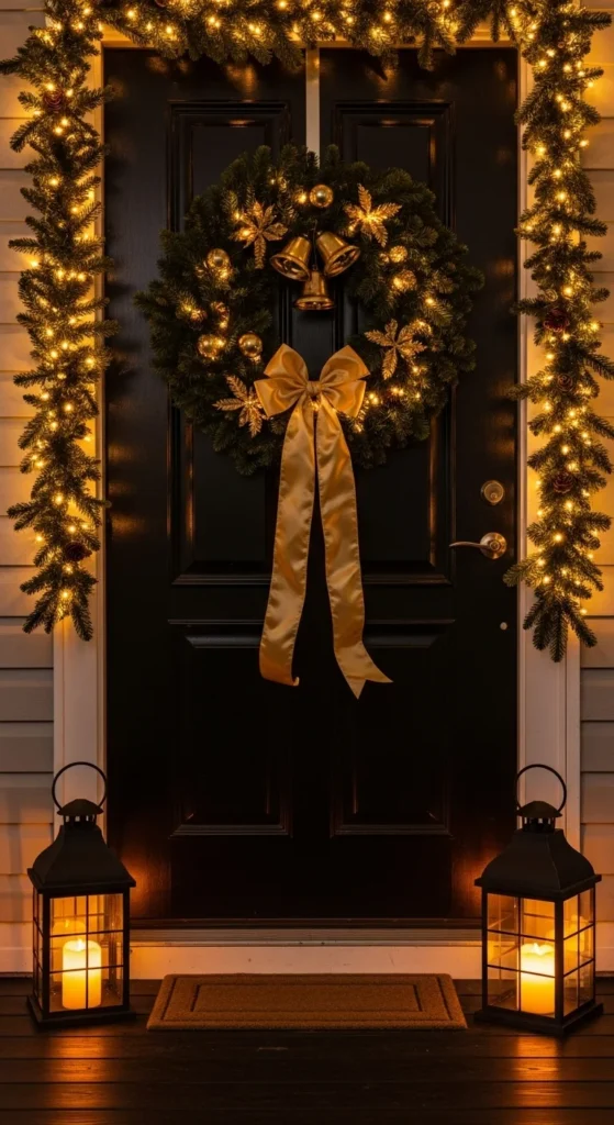 Gold accents bring warmth. Hang a wreath with cascading satin ribbon in gold tones. Add clusters of bells tied with thin ropes. Outline door frame with warm light strands. Keep greenery simple so gold elements shine. This look pairs beautifully with black or navy doors. For added richness, place brass-style lanterns on steps. Use sheer ribbon layered with satin for soft movement when breeze hits.