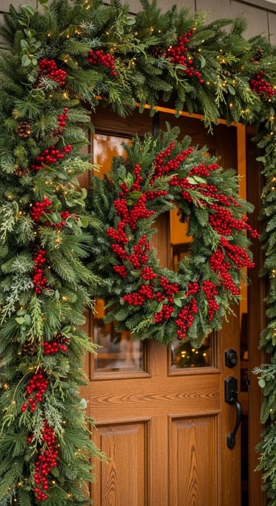 Red berries bring life to greenery. Wrap berry stems throughout pine garland and wreath. Add warm lights so berries catch gentle shine. Tie a simple velvet bow and leave rest of the door neutral. Place red berry sprigs in planters beside doorway. This approach works well if you love nature-inspired design with a pop of holiday color. If you prefer soft tones, use cranberry-deep red rather than bright.