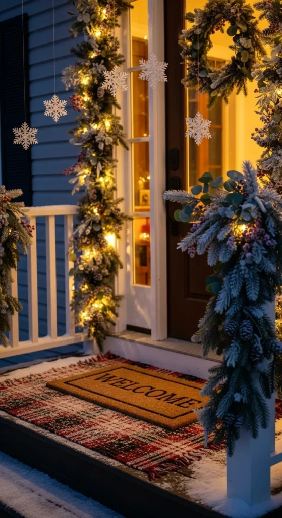 Create a floating snowflake moment by hanging snowflakes from fishing line across the porch overhang. Space them at staggered heights for movement. Add greenery around the door and soft lights. Layer your doormat over a plaid rug for grounding. This look works especially well with neutral or soft palettes. Kids enjoy watching snowflakes move in winter breeze. If using paper snowflakes, laminate or spray with finish to prevent moisture damage. For night sparkle, tuck tiny light strings inside a few snowflake shapes.